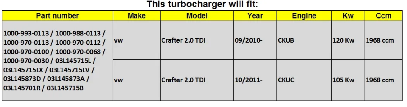| VW | Crafter 30-50 | 2014 | Diesel Chassis Cab | 2.0 TDI | RWD — 2F_ | 1968cc 105KW 142HP CKUC |